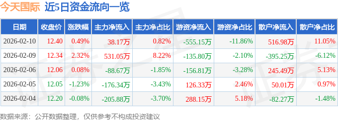 证券之星消息,截至2026年2月10日收盘,今天国际(300532)报收于12.4元,上涨0.49%,换手率 0.87%,成交量3.77万手,成交额4679.68万元。 2月10日的资金流向数据方面,主力资金净流入38.17万元,占总成交额0.82%,游资资金净流出555.15 万元,占总成交额11.86%,散户资金净流入516.98万元,占总成交额11.05%。 近5日资金流向一览见下表: | 指标 | 今天国际 | 互联网服务行业均值 | 行业排名 | | --- | --- | --- | --- | | 总市值 | 56.3亿元 | 155.35亿元 | 97 145 | | 净资产 | 18.66亿元 | 35.05亿元 | 59 145 | | 净利润 | 2.2亿元 | 1.43亿元 | 15 145 | | 市盈率(动) | 19.17 | 143.76 | 2 145 | | 市净率 | 3.17 | 11.1 | 31 145 | | 毛利率 | 25.91% | 31.42% | 80 145 | | 净利率 | 12.89% | -5.37% | 17 145 | | ROE | 12 ...