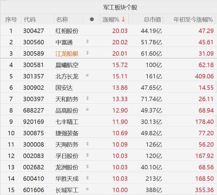| | | | | 军工板块个股 | | | | --- | --- | --- | --- | --- | --- | --- | | 序号 代码 | | 名称 | . | 涨幅%↓ | 总市值 | 年初至今涨幅% | | 1 | 300427 | 红相股份 | | 20.03 | 44.19亿 | 47.29 | | 2 | 300560 | 中富通 | 1 | 20.02 | 51.78亿 | 45.61 | | 3 | 300589 | 江龙船艇 | 1 | 20.01 | 61.60亿 | 31.09 | | ব | 300581 | 晨曦航空 | | 15.72 | 100亿 | 62.18 | | 5 | 301357 | 北方长龙 | * | 15.11 | 161亿 | 409.06 | | 6 | 300902 | 国安达 | | 13.86 | 47.65 Z | 14.55 | | 7 | 300397 | 天和防务 | હે | 13.33 | 71.74亿 | 26.11 | | 8 | 688227 | 品高股份 | 来 | 12.90 | 49.37 亿 | 68.94 | | ...