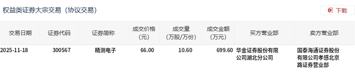 11月18日,精测电子大宗交易成交10.6万股,成交额699.6万元,占当日总成交额的2.63%,成交价66 元,较市场收盘价70.01元折价5.73%。 | 交易日期 | 证券代码 | 证券简称 | 成交价格 (元) | 成交量 | 成交金额 买方营业部 (万元) | 卖方营业部 | | --- | --- | --- | --- | --- | --- | --- | | | | | | (万股/万份) | | | | 2025-11-18 | 300567 | 精測电子 | 66.00 | 10.60 | 699.60 华金证券股份有限 | 国泰海通证券股份 | | | | | | | 公司湖北分公司 | 有限公司孝感北京 | | | | | | | | 路班弟营不部 | ...