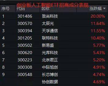 | | (+CH) | TF招商成 | 涨跌幅 | | --- | --- | --- | --- | | | 301486 | 致尚科技 | | | 2 | 300570 | 太辰光 | 11.64% | | 3 | 300394 | 天孚通信 | 11.55% | | 4 | 301205 | 联特科技 | 10.40% | | 5 | 300502 | 新易盛 | 5.77% | | 6 | 300620 | 光库科技 | 5.43% | | 1 | 300223 | 北京君正 | 5.20% | | 8 | 300308 | 中际旭创 | 4.91 % | | | 300548 | 长芯博创 | 4.4% | | | | 协创数据 | 46996 | 1月30日,创业板午后走强。数据显示,截至14时2分,创业板人工智能ETF招商(159243)涨2.38%,一 度涨2.99%。成分股致尚科技、天孚通信、太辰光、联特科技、新易盛涨幅居前。 长城证券表示,数据中心因为流量爆发带来的光模块需求仍是目前光模块发展核心驱动力。随着AIGC 的发展,国内外大模型推理侧数据量的快速上升,将进一步催化光模块算力需求的 ...
