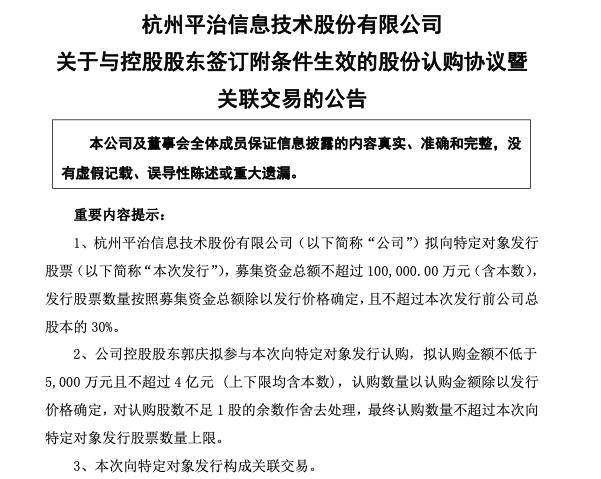 格隆汇2月11日丨平治信息(300571.SZ)公布,拟向特定对象发行股票募集资金总额不超过10亿元,扣除 发行费用后用于国产智能算力中心建设项目、补充流动资金。本次向特定对象发行对象中包含公司控股 股东郭庆,其参与认购本次发行股票的行为构成与本公司的关联交易。 ...