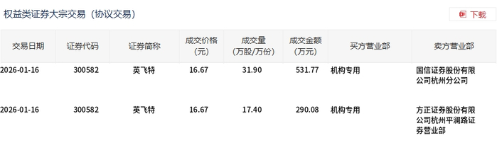 英飞特1月16日现2笔大宗交易 总成交金额821.85万元 其中机构买入821.85万元 溢价率为-13.58%