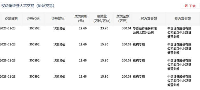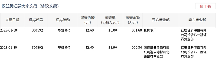 | 交易日期 | 证券代码 | 证券简称 | 成交价格 | 成交量 | 成交金额 | 买方营业部 | 卖方营业部 | | --- | --- | --- | --- | --- | --- | --- | --- | | | | | (元) | (万股/万份) | (万元) | | | | 2026-01-30 | 300592 | 华凯易佰 | 12.60 | 16.00 | | 201.60 机构专用 | 红塔证券股份有限 公司长沙八一路证 | | | | | | | | | 劳营业部 | | 2026-01-30 | 300592 | 华凯易佰 | 12.60 | 15.90 | | 200.34 国投证券股份有限 | 红塔证券股份有限 | | | | | | | | 公司连云港都州北 | 公司长沙八一路证 | | | | | | | | 路班券昌不部 | 券营业部 | 1月30日,华凯易佰大宗交易成交31.9万股,成交额401.94万元,占当日总成交额的1.26%,成交价12.6 元,较市场收盘价14.2元折价11.27%。 ...