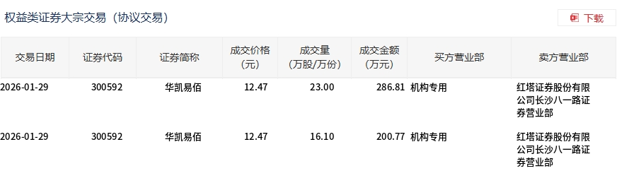 | 交易日期 | 证券代码 | 证券简称 | 成交价格 (元) | 成交量 (万股/万份) | 成交全额 (万元) | 买方营业部 | 卖方营业部 | | --- | --- | --- | --- | --- | --- | --- | --- | | 2026-01-29 | 300592 | 华凯易佰 | 12.47 | 23.00 | 286.81 机构专用 | | 红塔证券股份有限 | | | | | | | | | 公司长沙八一路证 | | | | | | | | | 券营业部 | | 2026-01-29 | 300592 | 华凯易佰 | 12.47 | 16.10 | 200.77 机构专用 | | 红塔证券股份有限 | | | | | | | | | 公司长沙八一路证 | | | | | | | | | 券营业部 | 1月29日,华凯易佰大宗交易成交39.1万股,成交额487.58万元,占当日总成交额的1.04%,成交价12.47元,较市场收盘价 13.85元折价9.96%。 ...