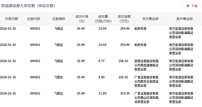 Summary of Key Points Core Viewpoint - On January 16, Feirongda executed a block trade of 477,700 shares, amounting to 14.0874 million yuan, which represented 1.77% of the total trading volume for the day. The transaction price was 29.49 yuan, reflecting a discount of 10.77% compared to the market closing price of 33.05 yuan [1]. Group 1: Transaction Details - The block trade involved a total of 477,700 shares at a price of 29.49 yuan per share [1]. - The total transaction value was 14.0874 million yuan, indicating a significant trading activity on that day [1]. - The transaction price was at a discount of 10.77% compared to the market closing price, suggesting potential buying interest at lower valuations [1]. Group 2: Trading Volume and Participants - The trading volume included multiple transactions, with the largest being 110,000 shares, contributing to a total of 324.39 thousand yuan from one of the brokerage firms [2]. - Various brokerage firms participated in the trades, including institutions like Zheshang Securities and GF Securities, indicating a diverse interest from institutional investors [2]. - The trades were primarily executed through institutional accounts, highlighting the involvement of professional investors in this transaction [2].