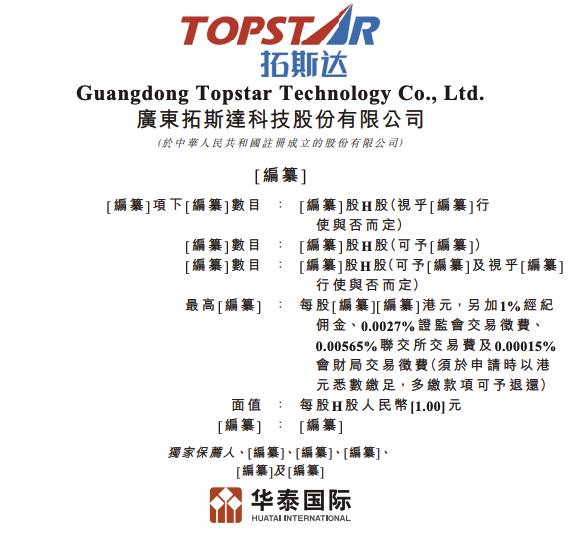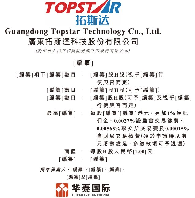 (於中華人民共和國註冊成立的股份有限公司) [編纂] 「編纂]項下[編纂]數目 : [編纂]股H股(視乎[編纂]行 使與否而定) 据港交所文件,1月16目,广东拓斯达科技股份有限公司向港交所递交上市申请,华泰国际为独家保荐 人。 TOPSTP ł6則方 Guangdong Topstar Technology Co., Ltd. 廣東拓斯達科技股份有限公司 [編纂] : [編纂] [编纂]及[编纂] 「編纂]數目 : [編纂]股H股(可予[編纂]) 「編纂]數目 : [编纂]股H股(可 予[編纂]及視 乎[编纂] 行使與否而定) 最高 [ 編 纂] : 每 股 [ 編 纂] 編 纂] 港 元,另 加 1% 經 紀 佣 金、0.0027% 證 監 會 交 易 徵 費 、 0.00565% 聯 交 所交 易 費 及 0.00015% 會財局交易徵費(須於申請時以港 元 悉數 繳 足,多 繳 款 項 可 予 退 還) 面值 : 每股H股人民幣[1.00]元 獨家保薦人、[編纂]、[編纂]·[編纂]· ...
