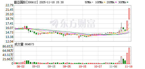 Core Viewpoint - Xuan Ya International (stock code: 300612) has experienced significant stock price volatility, with a cumulative increase of over 30% in two consecutive trading days, leading to a classification of abnormal trading behavior [2][3]. Trading Information Summary - On November 18, 2025, Xuan Ya International closed at 21.83 yuan, marking a 20.01% increase and achieving a limit-up for two consecutive days. The turnover rate was 44.73%, with a trading volume of 804,600 hands and a transaction value of 1.655 billion yuan [1]. - The stock reached its limit-up at 9:41 AM, with five instances of limit-up being opened before closing. The closing order funds amounted to 87.6412 million yuan, representing 2.23% of its circulating market value [1][3]. Fund Flow Summary - On November 18, the net inflow of main funds was 60.239 million yuan, while the net outflow of speculative funds was 57.1883 million yuan, and retail investors experienced a net outflow of 3.0506 million yuan [1][3]. Company Announcement Summary - The company confirmed that the stock's price deviation over the past two days exceeded 30%, constituting abnormal volatility. The board verified that there were no undisclosed significant matters and that recent operational conditions remained normal. The controlling shareholder and actual controller did not engage in stock trading activities [2][3].