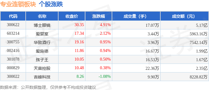 证券之星消息,11月24日专业连锁板块较上一交易日上涨1.97%,华致酒行领涨。当日上证指数报收于 3836.77,上涨0.05%。深证成指报收于12585.08,上涨0.37%。专业连锁板块个股涨跌见下表: | 代码 | 名称 | 收盘价 | 涨跌幅 | 成交量(手) | 成交额(元) | | | --- | --- | --- | --- | --- | --- | --- | | 300755 | 华致酒行 | 18.98 | 3.60% | 6.42万 | | 1.22亿 | | 000829 | 天音控股 | 10.44 | 3.47% | 25.80万 | | 2.671Z | | 300622 | 博士眼镜 | 28.93 | 2.63% | 8.52万 | | 2.42亿 | | 002416 | 爰施德 | 11.75 | 1.47% | 14.60万 | | 1.71亿 | | 301078 | 孩子王 | 10.00 | 1.11% | 16.62万 | | 1.65亿 | | 300022 | 吉峰科技 | 8.35 | 0.36% | 10.15万 | | 8523.07万 | | ...