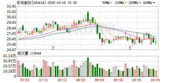 彩讯科技股份有限公司 2025 年第三季度报告 证券代码:300634 证券简称:彩讯股份 公告编号:2025-078 彩讯科技股份有限公司 2025 年第三季度报告 本公司及董事会全体成员保证信息披露的内容真实、准确、完整,没有虚假记载、误导性陈述或重大遗漏。 重要内容提示: 1. 董事会及董事、高级管理人员保证季度报告的真实、准确、完整,不存在虚假记载、误导性陈述或重大遗漏,并承担个 别和连带的法律责任。 2.公司负责人、主管会计工作负责人及会计机构负责人(会计主管人员)声明:保证季度报告中财务信息的真实、准确、完 整。 3.第三季度财务会计报告是否经过审计 □是 否 1 彩讯科技股份有限公司 2025 年第三季度报告 一、主要财务数据 (一) 主要会计数据和财务指标 公司是否需追溯调整或重述以前年度会计数据 □是 否 | | 本报告期 | 本报告期比上年同 | | 年初至报告期 | | --- | --- | --- | --- | --- | | | | 期增减 | 年初至报告期末 | 末比上年同期 | | | | | | 增减 | | 营业收入(元) | 421,840,602.05 | -1.76 ...