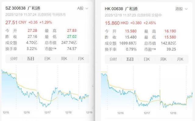 本报(chinatimes.net.cn)记者胡梦然 见习记者 黄海婷 深圳报道 12月19日,截至收盘,广和通A股较开盘时上涨的0.63%,单日微跌0.22%,报27.10元/股,成交7.94亿 元,换手率5.46%,总市值244.04亿元。其H股盘中上涨1.81%,报15.76港元/股,成交1618万元,换手 率1.21%,总市值141.92亿元。较18日的双线下跌,广和通"A+H"股价已显露止跌企稳迹象。 10月22日,作为全球市场份额第二的无线通信模组龙头广和通登陆港交所,完成了"A+H"两地上市的关 键一跃。然而,这场备受瞩目的资本布局,在随后的两个月里却上演了一出跌宕起伏的市场心理剧。上 市初期,其A股因"端侧AI"等前沿题材被热炒,而H股则显得冷静理性,形成鲜明的"温差";但剧情在 12月中旬陡然转折,两地股价罕见地同步下跌。 可能不太稳定"。与此同时,根据市盈率估值模型,广和通当前市盈率高达58.02,估值分位点处于上市 以来92.56%的极高位置。这意味着,即便经历回调,其估值性价比对长期资金而言仍缺乏吸引力。 几位股民的直观感受,也印证了数据揭示的情绪转变。 一度乐观的梁先生接受记者采访时 ...