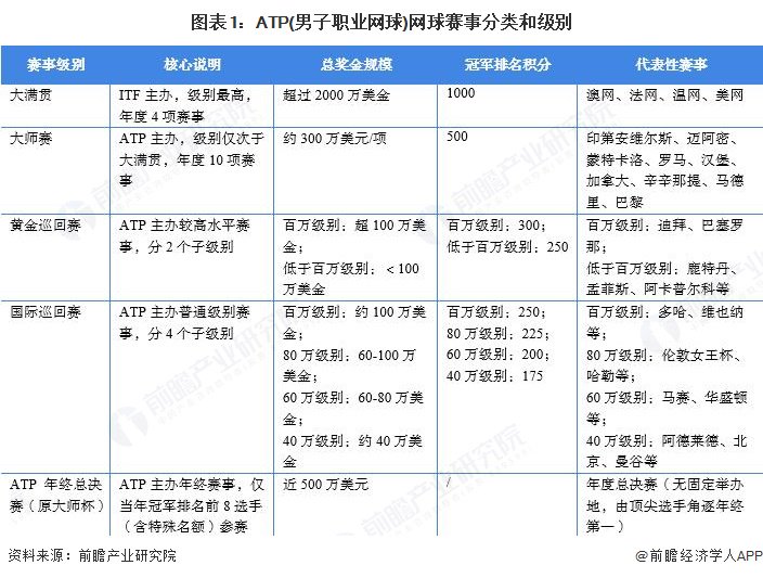 转自:前瞻产业研究院 以下数据及分析来自于前瞻产业研究院网球研究小组发布的《中国球类制造行业市场前瞻与投资战略规 划分析报告》。 行业主要上市公司:安踏体育(02020.HK);李宁(02331.HK);金陵体育(维权)(300651.SZ);中体产业 (600158.SH);亚玛芬体育(AS.N)等 本文核心数据:中国网球市场规模;中国网球竞争格局 行业概况 1、概述及分类 网球是一项球类运动,通常在两个单打球员或两对组合之间进行。球员在网球场上隔着球网用网球拍击 打网球。游戏的目的是使对手无法有效地操纵球回到自己。无法返回球的球员将无法获得积分,而对手 则获得积分。网球赛事分类和级别可分为ATP(男子职业网球)和WTA(女子职业网球)两类,其中ATP为 Association of Tennis Professional的英文缩写,即国际职业网球联合会,也称职业网球球员协会,是世界男 子职业网球选手的"自治"管理组织机构。WTA为Women's Tennis Association的英文缩写,即女子网球协 会。 | 赛事领别 | 核心说明 | 总奖金规模 | 冠军排名积分 | 代表性赛事 | | --- ...