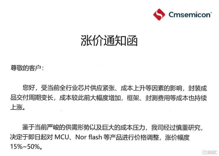 两家半导体公司宣布芯片涨价。 1月27日晚间,中微半导(688380.SH)在官方微信号发布了涨价函,表示鉴于当前严峻的供需形势以及巨大的成本压力,经过慎重研究,决定于即日起 对MCU、Nor flash等产品进行价格调整,涨价幅度为15%至50%。 对于涨价原因,中微半导表示,受当前全行业芯片供应紧张、成本上升等因素的影响,封装成品交付周期变长,成本较此前大幅度增加,框架、封测费用 等成本也持续上涨。 中微半导还强调,如果后续成本再次发生大幅变动,价格也将跟进调整。 中微半导体(深圳)股份有限公司是一家以微控制器(MCU)研发与设计为核心的平台型芯片设计公司,为消费电子、智能家电、工业控制及汽车电子 等领域提供芯片级一站式整体解决方案。 截至27日收盘,中微半导股价报45.71元/股,最新市值为183亿元。 另外,据上海证券报报道,国科微(300672.SZ)已对客户发出涨价函,宣布自1月起对合封512Mb的KGD(已知合格芯片)产品涨价40%,对合封1Gb的 KGD产品涨价60%,对合封2Gb的KGD涨价80%,对外挂DDR的产品价格另行通知。 中微半导近日公告显示其业绩爆发,预计2025年归属于上市公司 ...