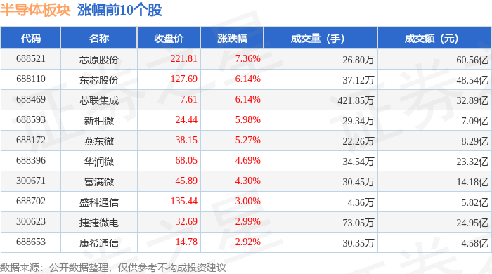 证券之星消息,1月26日半导体板块较上一交易日下跌2.38%,国科微领跌。当日上证指数报收于4132.61,下跌0.09%。深证成指报收于 14316.64,下跌0.85%。半导体板块个股涨跌见下表: | 代码 | 名称 | 收盘价 | 涨跌幅 | 成交量(手) | 成交额(元) | | | --- | --- | --- | --- | --- | --- | --- | | 688521 | 芯原股份 | 221.81 | 7.36% | 26.80万 | | 60.56 Z | | 688110 | 东芯股份 | 127.69 | 6.14% | 37.12万 | | 48.54亿 | | 688469 | 芯联集成 | 7.61 | 6.14% | 421.85万 | | 32.89亿 | | 6888889 | 新相微 | 24.44 | 5.98% | 29.34万 | | 7.09亿 | | 688172 | 症矢微 | 38.15 | 5.27% | 22.26万 | | 8.29亿 | | 688396 | 华润微 | 68.05 | 4.69% | 34.54万 | | 23.32亿 | ...