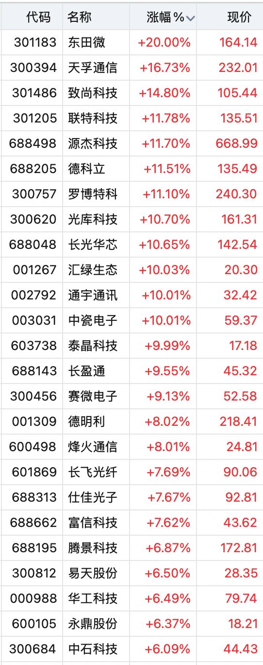 | 688313 仕佳光子 | | +7.67% | 92.81 | | --- | --- | --- | --- | | 688662 | 富信科技 | +7.62% | 43.62 | | 688195 | 腾景科技 | +6.87% | 172.81 | | 300812 | 易天股份 | +6.50% | 28.35 | | 000988 | 华工科技 | +6.49% | 79.74 | | 600105 | 永鼎股份 | +6.37% | 18.21 | | 300684 | 中石科技 | +6.09% | 44.43 | 编辑 | 钉钉 12月8日,CPO概念股涨势扩大,截至发稿, 东田微20%涨停, 天孚通信涨近17%,源杰科技涨超 11%,长光华芯涨超10%,仕佳光子、永鼎股份涨超6%,股价盘中均创出历史新高。 | 代码 | 名称 | 涨幅 % v | 现价 | | --- | --- | --- | --- | | 301183 | 东盟微 | +20.00% | 164.14 | | 300394 | 天孚通信 | +16.73% | 232.01 | | 301486 | 致尚科技 ...