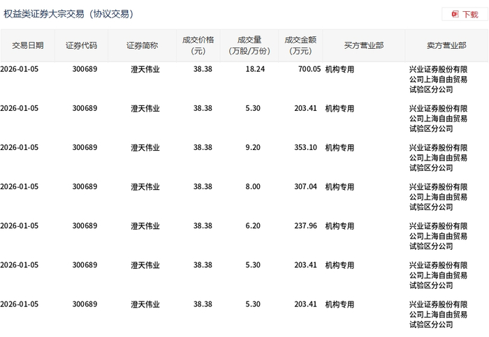 1月5日,澄天伟业大宗交易成交57.54万股,成交额2208.38万元,占当日总成交额的18.68%,成交价 38.38元,较市场收盘价46.81元折价18.01%。 | 交易日期 | 证券代码 | 证券简称 | 成交价格 | 成交量 | 成交金额 | 买方营业部 | 卖方营业部 | | --- | --- | --- | --- | --- | --- | --- | --- | | | | | (元) | (万股/万份) | (万元) | | | | 2026-01-05 | 300689 | 澄天伟业 | 38.38 | 18.24 | 700.05 机构专用 | | 兴业证券股份有限 | | | | | | | | | 公司上海自由贸易 | | | | | | | | | 试验区分公司 | | 2026-01-05 | 300689 | 澄天伟业 | 38.38 | 5.30 | 203.41 机构专用 | | 兴业证券股份有限 | | | | | | | | | 公司下海自由贸易 | | | | | | | | | 试验区分公司 | | 2026-01-05 | 300689 | 澄天伟业 | 38 ...