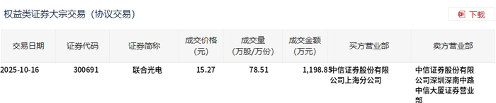 | 权益类证券大宗交易(协议交易) | | | | | | | 团 下载 | | --- | --- | --- | --- | --- | --- | --- | --- | | 交易日期 | 证券代码 | 证券简称 | 成交价格 (元) | 成交量 (万股/万份) | 成交金额 (万元) | 买方营业部 | 卖方营业部 | | 2025-10-16 | 300691 | 联合光电 | 15.27 | 78.51 | | 1,198.85中信证券股份有限 | 中信证券股份有限 | | | | | | | | 公司上海分公司 | 公司深圳深南中路 | | | | | | | | | 中信大厦证券营业 नार | 10月16日,联合光电大宗交易成交78.51万股,成交额1198.85万元,占当日总成交额的14.07%,成交价 15.27元,较市场收盘价17.64元折价13.44%。 ...