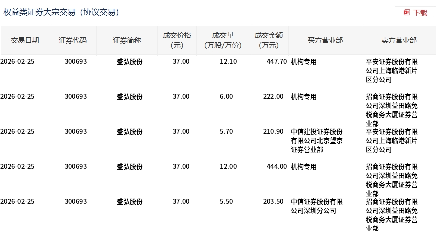 | 交易日期 | 证券代码 | 证券简称 | 成交价格 | 成交量 | 成交全额 | 买方营业部 | 卖方营业部 | | --- | --- | --- | --- | --- | --- | --- | --- | | | | | (元) | (万股/万份) | (万元) | | | | 2026-02-25 | 300693 | 盛弘股份 | 37.00 | 12.10 | 447.70 机构专用 | | 平安证券股份有限 | | | | | | | | | 公司上海临港新片 | | | | | | | | | 区分公司 | | 2026-02-25 | 300693 | 盛弘股份 | 37.00 | 6.00 | 222.00 机构专用 | | 招商证券股份有限 | | | | | | | | | 公司深圳益田路免 | | | | | | | | | 税商务大厦证券营 | | | | | | | | | 业部 | | 2026-02-25 | 300693 | 雷张股份 | 37.00 | 5.70 | | 210.90 中信建投证券股份 | 平安证券股份有限 | | | | | | | | 有限公司北 ...