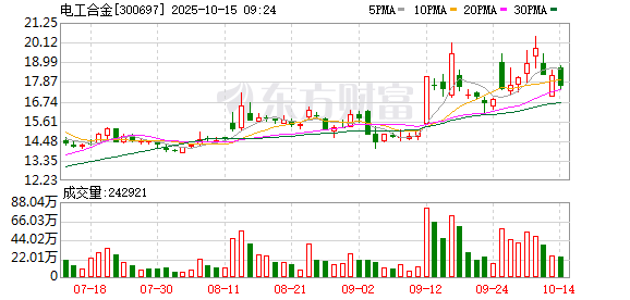 资料显示,江阴电工合金股份有限公司位于江苏省江阴市周庄镇世纪大道北段398号,成立日期1985年6 月12日,上市日期2017年9月7日,公司主营业务涉及铜及铜合金产品的研发、生产和销售。主营业务收 入构成为:铜母线系列产品66.21%,电气化铁路接触网系列产品29.90%,新能源汽车高压连接件产品 3.29%,其他(补充)0.60%。 电工合金所属申万行业为:有色金属-工业金属-铜。所属概念板块包括:股权转让、小米汽车概念、蔚 来汽车概念、新能源车、风能等。 资金流向方面,主力资金净流出1272.72万元,特大单买入600.18万元,占比2.63%,卖出931.67万元, 占比4.08%;大单买入3447.47万元,占比15.09%,卖出4388.70万元,占比19.21%。 电工合金今年以来股价涨87.09%,近5个交易日跌1.27%,近20日涨21.78%,近60日涨22.20%。 今年以来电工合金已经6次登上龙虎榜,最近一次登上龙虎榜为9月12日,当日龙虎榜净买入1.12亿元; 买入总计2.78亿元 ,占总成交额比19.56%;卖出总计1.65亿元 ,占总成交额比11.65%。 10月14日,电工合金 ...