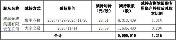 2025年前三季度,公司实现营业收入19.86亿元,同比增长4.40%;归属于上市公司股东的净利润 4.15亿元,同比减少32.55%;归属于上市公司股东的扣除非经常性损益的净利润3.76亿元,同比减少 32.22%;经营活动产生的现金流量净额2.88亿元,同比增长179.27%。 (责任编辑:田云绯) | 股东名称 | 减持方式 | 减持期间 | 减持均价 (元/股) | 减持股数 (股) | 减持占剔除回购专 用账户持股后总股 | | --- | --- | --- | --- | --- | --- | | | | | | | 本比例 | | 威海光威 集团有限 | 集中竞价 | 2025/9/29-2025/11/20 | 28. 61 | 8, 313, 439 | 1. 01% | | 责任公司 | 大宗交易 | 2025/11/14 | 26. 69 | 1.686. 480 | 0. 20% | | | | 合计 | | 9, 999, 919 | 1.21% | 2022年至2024年,公司营业收入分别为25.11亿元、25.18亿元、24.50亿元,归属于上市公司股东的 净利润分别为9.3 ...