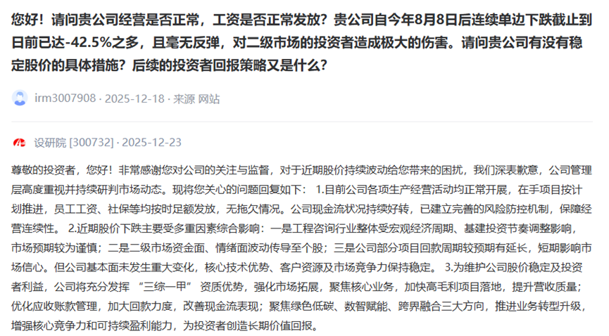 早在2018年1月24日,设研院股价最高冲击至19.45元/股(前复权);截至目前,公司股价仅剩不到8元/股,较2018年1月24 日的最高价回调超过60%。 尽管今日(12月24日),设研院(300732)股价反弹1.34%,但自今年8月11日至今,公司股价累计跌幅依然超过35%,这一跌 幅不仅位居申万二级工程咨询服务的首位,也位居整个A股市场跌幅的前25名。 对于股价的下跌,有投资者在互动平台表达不满。12月18日,有投资者提问"贵公司自今年8月8日后连续单边下跌截止到日 前已达-42.5%之多,且毫无反弹,对二级市场的投资者造成极大的伤害。" 公司回复称:"近期股价下跌主要受多重因素综合影响:一是工程咨询行业整体受宏观经济周期、基建投资节奏调整影响, 市场预期较为谨慎;二是二级市场资金面、情绪面波动传导至个股;三是公司部分项目回款周期较预期有延长,短期影响 市场信心。但公司基本面未发生重大变化,核心技术优势、客户资源及市场竞争力保持稳定。" ...