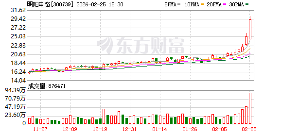 证券日报网讯 2月25日,明阳电路发布公告称,公司于2026年2月13日、2026年2月24日、2026年2月25 日连续三个交易日内收盘价格涨幅偏离值累计超过30%,属于股票交易异常波动情形。经核实,公司前 期披露的信息不存在需要更正、补充之处;公司未发现近期公共传媒报道了可能或已经对公司股票交易 价格产生较大影响的未公开重大信息;公司近期生产经营情况及内外部经营环境未发生重大变化,公司 生产经营正常。 (文章来源:证券日报) ...