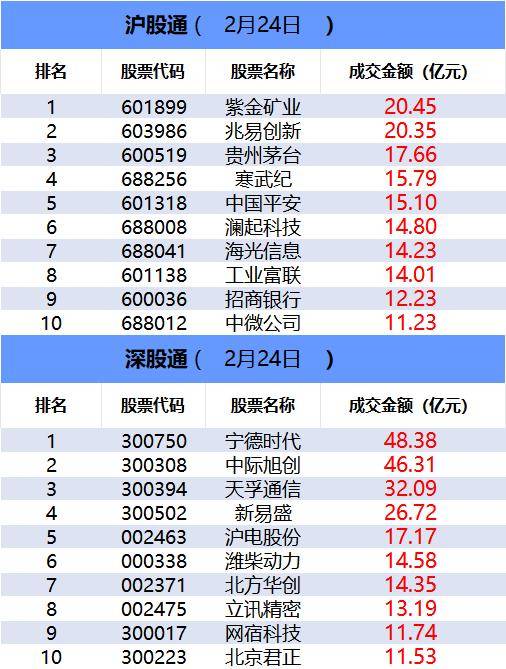 | | 沪股通( | 2月24日 D | | | --- | --- | --- | --- | | 排名 | 股票代码 | 股票名称 | 成交金额(亿元) | | 1 | 601899 | 紫金矿业 | 20.45 | | 2 | 603986 | 兆易创新 | 20.35 | | 3 | 600519 | 贵州茅台 | 17.66 | | 4 | 688256 | 寒武纪 | 15.79 | | 5 | 601318 | 中国平安 | 15.10 | | 6 | 688008 | 澜起科技 | 14.80 | | 7 | 688041 | 海米信息 | 14.23 | | 8 | 601138 | 工业富联 | 14.01 | | 9 | 600036 | 招商银行 | 12.23 | | 10 | 688012 | 中微公司 | 11.23 | | | 深胺道( | 2月24日 | | | 招 | 股票代码 | 股票名称 | 成交金额(亿元) | | 1 | 300750 | 宁德时代 | 48.38 | | 2 | 300308 | 中标旭创 | 46.31 | | 3 | 300394 | 天孚通信 ...
