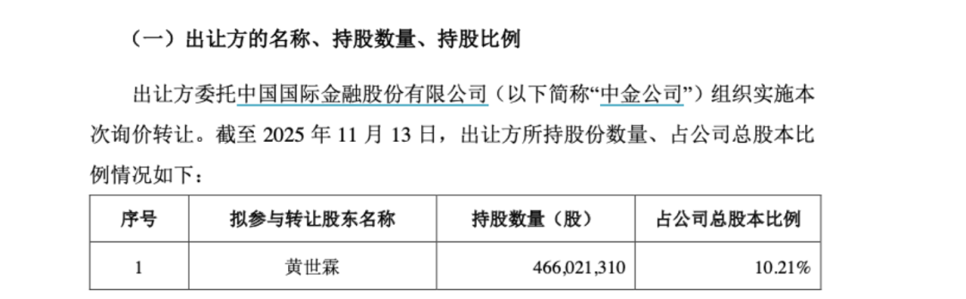 宁德时代(300750)11月14日深夜公告,公司股东黄世霖拟通过询价方式转让所持公司A股股份;转让的股份数量为4563.24万股,占公司总股本的比例为 1%。 以宁德时代截至11月14日的收盘价(404.12元/股)估算,上述股份市值约184.41亿元。 黄世霖出生于1967年,福建宁德市人,毕业于合肥工业大学。截至目前,黄世霖直接持有宁德时代4.66亿股A股股份,占公司总股本的10.21%,市值约 1883.2亿元。在2025年胡润百富榜上,黄世霖以1500亿元的财富值排名第23位。 按照相关规定,询价转让不通过集中竞价交易或大宗交易方式进行,不属于通过二级市场减持。受让方为具备相应定价能力和风险承受能力的机构投资者 等,受让的股份需锁定6个月。 从股吧言论以及一些投资人在朋友圈的发言来看,很多人倾向于黄世霖是为了达成自己的储能梦想。 在宁德时代任职时,黄世霖便长期负责公司的储能战略。2018年,黄世霖在第五届中国储能创新与技术峰会上表示,高安全、长寿命的电池是储能系统的 基础,高可靠、高效率是储能系统集成的关键。业界一起把核心技术、成本、安全可靠性等问题统统解决后,储能系统将来会以一个完整独立的运行系统 ...
