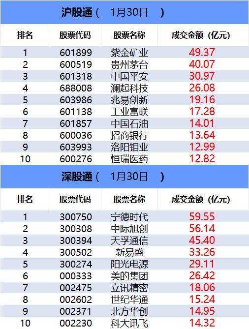 沪深股通今日合计成交3908.34亿,其中紫金矿业和宁德时代分居沪股通和深股通个股成交额首位。板 块主力资金方面,通信板块主力资金净流入居首。ETF成交方面,现金流ETF(159399)成交额环比增 长268%。 龙虎榜方面,有色金属板块今日遭重挫,兴业银锡跌停,四家机构逆势买入6.53亿。而湖南黄金今日回 封涨停,走出5连板,获两家一线游资(国联民生证券慈溪影清路、广发证券深圳后海)分别买入6.19 亿、2.86亿,同时遭四家机构卖出7.04亿。 一、沪深股通前十大成交 今日沪股通总成交金额为1863.42亿,深股通总成交金额为2044.92亿。 | | 沪股道( | 1月30日 D | | | --- | --- | --- | --- | | 排名 | 股票代码 | 股票名称 | 成交金额(亿元) | | 1 | 601899 | 三角,小 | 49.37 | | 2 | 600519 | 贵州茅台 | 40.07 | | 3 | 601318 | 中国平安 | 30.97 | | 4 | 688008 | 澜起科技 | 26.08 | | 5 | 603986 | 兆易创新 | 19.16 | | 6 ...