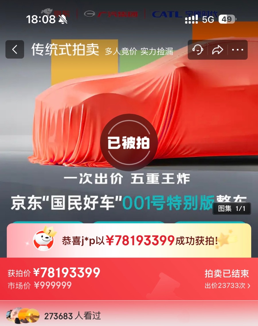 竞拍价定格7819万元!京东001号“国民好车”拍卖吸引超26万人参与