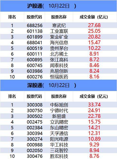 沪深股通今日合计成交2137.92亿,其中寒武纪和中际旭创分居沪股通和深股通个股成交额首位。板块主力资金方 面,石油化工板块主力资金净流入居首。ETF成交方面,法国CAC40ETF(513080)成交额环比增长486%。期指持 仓方面,IH、IF、IC合约空头减仓数量大于多头。龙虎榜方面,涨停的抗流感股特一药业获三家机构合计买入3909 万,同时获深股通买入2314万。合锻智能遭三家量化资金席位合计卖出1.4亿,一家机构卖出6844万,一家一线游资 席位卖出4192万。 | | | 星矿板块主力资金监控:今日买入前五榜(2025年10月22日) | | | --- | --- | --- | --- | | 排名 | 板块名称 | 主力资金净流入(亿元) | 主力资金净流入率(%) | | 1 | 石油石化 | 4.54 | 2.15 | | 2 | 家用电器 | 3.01 | 0.97 | | 3 | 建筑材料 | 2.93 | 1.78 | | 4 | 化学制药 | 2.37 | 0.62 | | 5 | 影视院线 | 0.42 | 0.84 | | | | 星矿板块主力资金监控:今日卖出前五榜(2025 ...