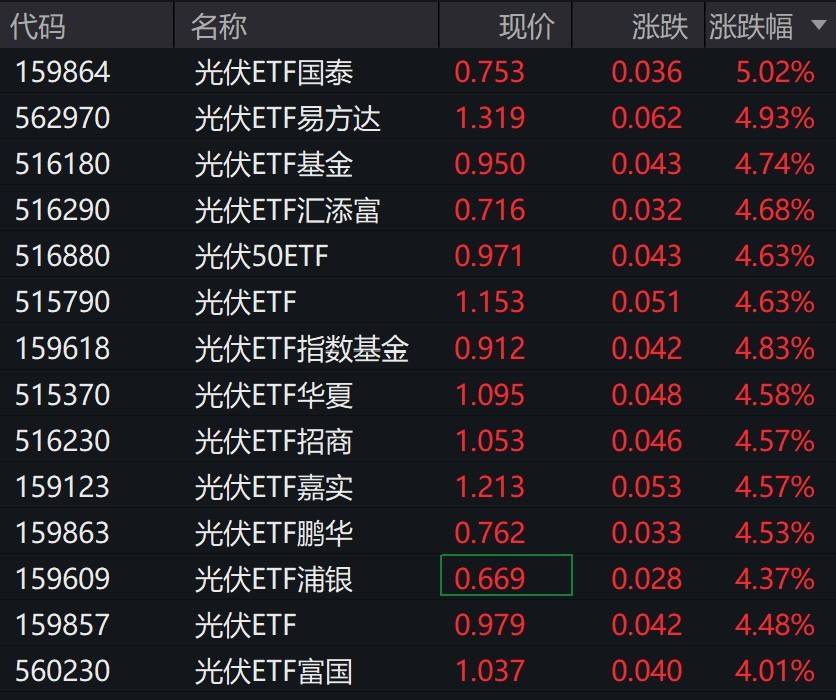 有券商表示,目前光伏行业估值仍处于历史偏低位置。展望后市,后续围绕反内卷的产品销售价格措施、企业间并购 整合、行业准入门槛的提高以及产品质量标准提高的政策将会相继落地。光伏行业竞争格局和产业链生态有望优化, 行业估值存在修复契机。 每日经济新闻 受盘面影响,光伏相关ETF涨超4%。 | 代码 | 名称 | 现价 | 涨跌 | 涨跌幅 | | --- | --- | --- | --- | --- | | 159864 | 光伏ETF国泰 | 0.753 | 0.036 | 5.02% | | 562970 | 光伏ETF易方达 | 1.319 | 0.062 | 4.93% | | 516180 | 光伏ETF基金 | 0.950 | 0.043 | 4.74% | | 516290 | 光伏ETF汇添富 | 0.716 | 0.032 | 4.68% | | 516880 | 光伏50ETF | 0.971 | 0.043 | 4.63% | | 515790 | 光伏ETF | 1.153 | 0.051 | 4.63% | | 159618 | 光伏ETF指数基金 | 0.912 | 0.042 | 4 ...