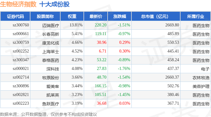 资金流向方面,生物经济(970038)指数成份股当日主力资金净流出合计8.93亿元,游资资金净流入合 计1.43亿元,散户资金净流入合计7.5亿元。成份股资金流向详情见下表: | 代码 | 名称 | 主力净流入(元) | 主力净占比 游资净流入 (元) | | 游资净占比 散户净流入 (元) | | 散户净占比 | | --- | --- | --- | --- | --- | --- | --- | --- | | 300759 | 康龙化成 | 4659.18万 | 6.98% | -1163.58万 | -1.74% | -3495.60万 | -5.23% | | 301363 美好医疗 | | 2495.52万 | 8.30% | -785.07万 | -2.61% | -1710.45万 | -5.69% | | 300298 | 三诺生物 | 1733.36万 | 15.29% | -951.84万 | -8.40% | -781.53万 | -6.90% | | 300832 | 新产业 | 1543.14万 | 11.26% | -177.90万 | -1.30% | -1365.24万 | ...