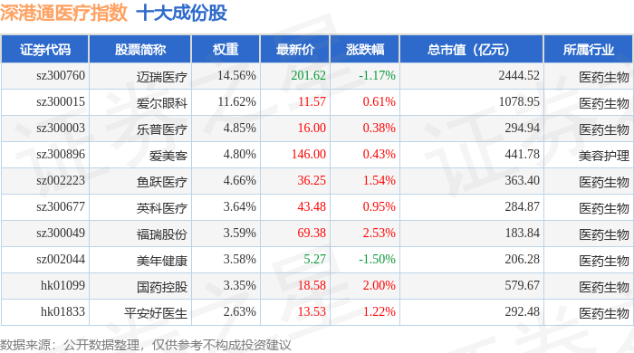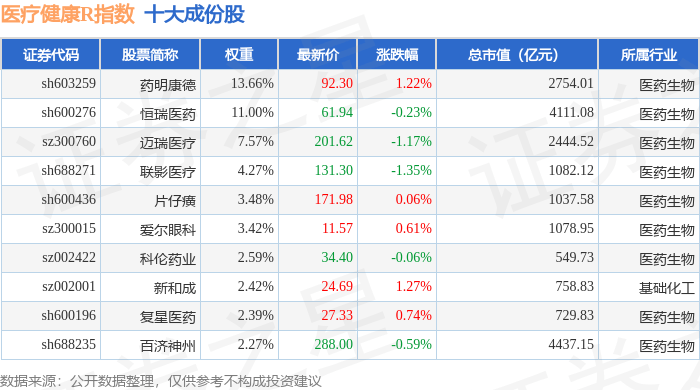 证券之星消息,12月1日,医疗健康R(480016)指数报收于7423.77点,涨0.31%,成交184.43亿元,换 手率0.67%。当日该指数成份股中,上涨的有34家,惠泰医疗以3.13%的涨幅领涨,下跌的有16家,奕瑞 科技以2.87%的跌幅领跌。 医疗健康R(480016)指数十大成份股详情如下: | 证券代码 | 股票简称 | 权重 | 最新价 | 涨跌幅 | 总市值(亿元) | | 所属行业 | | --- | --- | --- | --- | --- | --- | --- | --- | | sh603259 | 药明康德 | 13.66% | 92.30 | 1.22% | | 2754.01 | 医药生物 | | sh600276 | 恒瑞医药 | 11.00% | 61.94 | -0.23% | | 4111.08 | 医药生物 | | sz300760 | 迈瑞医疗 | 7.57% | 201.62 | -1.17% | | 2444.52 | 医药生物 | | sh688271 | 联影医疗 | 4.27% | 131.30 | -1.35% | | 1082.12 | 医药生物 ...
