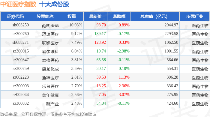 Core Viewpoint - The ChiNext Medical Index (970082) closed at 3882.75 points, down 0.63%, with a trading volume of 14.157 billion yuan and a turnover rate of 2.13% on February 6 [1] Group 1: Index Performance - Among the index constituents, 22 stocks rose while 28 stocks fell, with Tigermed leading the gainers at 3.06% and Aier Eye Hospital leading the decliners at 3.82% [1] - The top ten constituents of the ChiNext Medical Index include Aier Eye Hospital (9.18% weight, latest price 11.07, -3.82% change) and Tigermed (8.52% weight, latest price 65.65, +3.06% change) [1] Group 2: Market Capitalization - The total market capitalization of Aier Eye Hospital is approximately 103.232 billion yuan, while Tigermed's market capitalization is around 56.526 billion yuan [1] - Other notable companies include Mindray Medical (229.746 billion yuan) and Kanglong Chemical (55.486 billion yuan) [1] Group 3: Capital Flow - The net outflow of main funds from the ChiNext Medical Index constituents totaled 604 million yuan, while retail investors saw a net inflow of 412 million yuan [1] - The detailed capital flow shows that Tigermed had a net inflow of 14.716 million yuan from main funds, while retail investors experienced a net outflow of 1.41 million yuan [2]