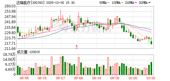 截至9月30日,迈瑞医疗股东户数10.88万,较上期增加18.86%;人均流通股11139股,较上期减少 15.87%。2025年1月-9月,迈瑞医疗实现营业收入258.34亿元,同比减少12.38%;归母净利润75.70亿 元,同比减少28.83%。 分红方面,迈瑞医疗A股上市后累计派现336.99亿元。近三年,累计派现233.88亿元。 10月30日,迈瑞医疗盘中下跌2.01%,截至14:08,报218.36元/股,成交18.28亿元,换手率0.68%,总市 值2647.49亿元。 资金流向方面,主力资金净流出1.20亿元,特大单买入2.11亿元,占比11.54%,卖出3.09亿元,占比 16.90%;大单买入4.86亿元,占比26.58%,卖出5.07亿元,占比27.76%。 迈瑞医疗今年以来股价跌13.25%,近5个交易日跌1.55%,近20日跌6.64%,近60日跌7.73%。 资料显示,深圳迈瑞生物医疗电子股份有限公司位于广东省深圳市南山区高新技术产业园区科技南十二 路迈瑞大厦1-4层,成立日期1999年1月25日,上市日期2018年10月16日,公司主营业务涉及医疗器械的 研发、制造、营销及服务 ...