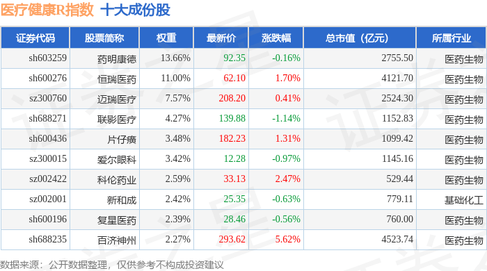 证券之星消息,11月12日,医疗健康R(480016)指数报收于7616.59点,涨0.5%,成交259.43亿元,换手率0.88%。当日该指数成份股中,上涨的 有27家,百济神州以5.62%的涨幅领涨,下跌的有21家,泰格医药以1.68%的跌幅领跌。 医疗健康R(480016)指数十大成份股详情如下: | 证券代码 | 股票简称 | 权重 | 最新价 | 涨跌幅 | 总市值(亿元) | | 所属行业 | | --- | --- | --- | --- | --- | --- | --- | --- | | sh603259 | 药明康德 | 13.66% | 92.35 | -0.16% | | 2755.50 | 医药生物 | | sh600276 | 恒瑞医药 | 11.00% | 62.10 | 1.70% | | 4121.70 | 医药生物 | | sz300760 | 迈瑞医疗 | 7.57% | 208.20 | 0.41% | | 2524.30 | 医药生物 | | sh688271 | 联影医疗 | 4.27% | 139.88 | -1.14% | | 1152.83 | 医药生物 | ...