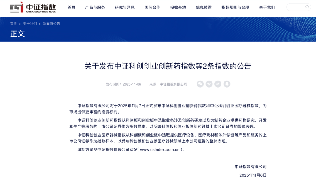 【 导读 】中证科创创业创新药指数、中证科创创业医疗器械指数 即将发布 中国基金报记者 忆山 11月6日,中证指数有限公司发布消息称, 将于11月7日正式发布中证科创创业创新药指数 和中证科创创业医疗器械指数 ,为市场提供更丰富的投资标的。 其中, 中证科创创业创新药指数 从科创板和创业板中选取业务涉及创新药研发以及为制药企 业提供药物研究、开发和生产等服务的上市公司证券作为指数样本,以反映科创板和创业板 创新药领域上市公司证券的整体表现。百济神州-U、百利天恒、康龙化成、智飞生物等50只 成份股被纳入。 | 688139.SH | 海尔生物 | 35.31 | 1.81 | 112.27 | | --- | --- | --- | --- | --- | | 688366.SH | 景海生科 | 50.36 | -15.25 | 107.47 | | 300298.SZ | 三诺生物 | 18.55 | -27.42 | 103.93 | | 300482.SZ | 万孚生物 | 21.59 | -1.84 | 101.06 | | 300244.SZ | 迪安诊断 | 16.15 | 44.65 | 10 ...
