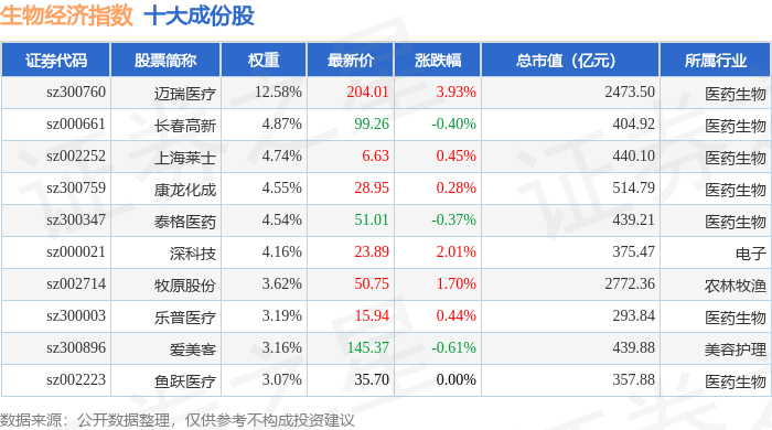 | THE COLLERS I VAND DX | | | | | | --- | --- | --- | --- | --- | | 证券代码 | 股票简称 | 权重 | 最新价 | 涨跌 | | sz300760 | 迈瑞医疗 | 12.58% | 204.01 | 3.5 | | sz000661 | 长春高新 | 4.87% | 99.26 | -0.4 | 证券之星消息,11月28日,生物经济(970038)指数报收于2151.91点,涨0.81%,成交125.6亿元,换手 率0.82%。当日该指数成份股中,上涨的有33家,迈瑞医疗以3.93%的涨幅领涨,下跌的有16家,华兰疫 苗以6.6%的跌幅领跌。 生物经济(970038)指数十大成份股详情如下: 资金流向方面,生物经济(970038)指数成份股当日主力资金净流出合计1.88亿元,游资资金净流入合 计2.05亿元,散户资金净流出合计1741.91万元。成份股资金流向详情见下表: 以上内容为证券之星据公开信息整理,由AI算法生成(网信算备310104345710301240019号),不构成 投资建议。 | 代码 | 名称 | 主力净流入(元) ...