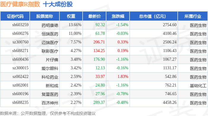 证券之星消息,11月14日,医疗健康(980016)指数报收于6572.66点,跌0.65%,成交233.97亿元,换 手率0.87%。当日该指数成份股中,上涨的有16家,甘李药业以2.0%的涨幅领涨,下跌的有33家,奕瑞 科技以3.74%的跌幅领跌。 | 代码 | 名称 | 主力净流入(元) | 主力净占比 游资净流入 (元) | | 游资净占比 散户净流入 (元) | | 散户净占比 | | --- | --- | --- | --- | --- | --- | --- | --- | | 603087 | 甘李药业 | 6297.79万 | 6.61% | -2315.28万 | -2.43% | -3982.51万 | -4.18% | | 002422 科伦药业 | | 5081.71万 | 12.92% | -2049.58万 | -5.21% | -3032.13万 | -7.71% | | 000661 | 长春高新 | 4881.38万 | 4.29% | 482.59万 | 4 0.42% | -5363.96万 | -4.71% | | 600535 | 天土力 | 2233.34万 | ...