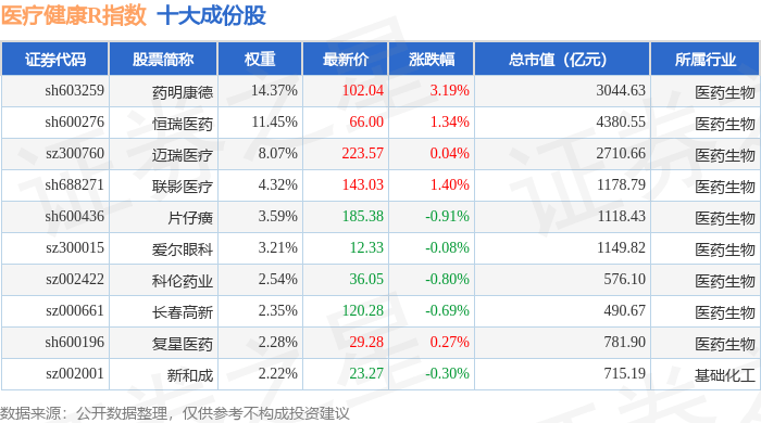证券之星消息,10月21日,医疗健康R(480016)指数报收于7852.45点,涨1.04%,成交220.52亿元,换 手率0.74%。当日该指数成份股中,上涨的有40家,华大智造以4.27%的涨幅领涨,下跌的有9家,片仔 癀以0.91%的跌幅领跌。 | 代码 | 名称 | 主力净流入(元) | 主力净占比 游资净流入(元) | | 游资净占比 散户净流入(元) | | 散户净占比 | | --- | --- | --- | --- | --- | --- | --- | --- | | 603259 | 药明康德 | 3.53 Z ﮯ | 10.39% | -1.04 Z | -3.07% | -2.48 Z | -7.32% | | 002001 | 新和成 | 9003.59万 | 16.34% | -3992.86万 | -7.25% | -5010.73万 | -9.10% | | 300759 | 康龙化成 | 8487.06万 | 15.05% | -3094.42万 | -5.49% | -5392.64万 | -9.56% | | 600276 | 恒瑞医药 | 7641.78万 | 3. ...
