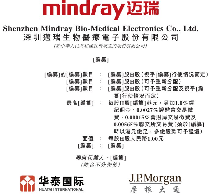 迈瑞医疗向香港联交所递交H股发行并上市申请并刊发申请资料