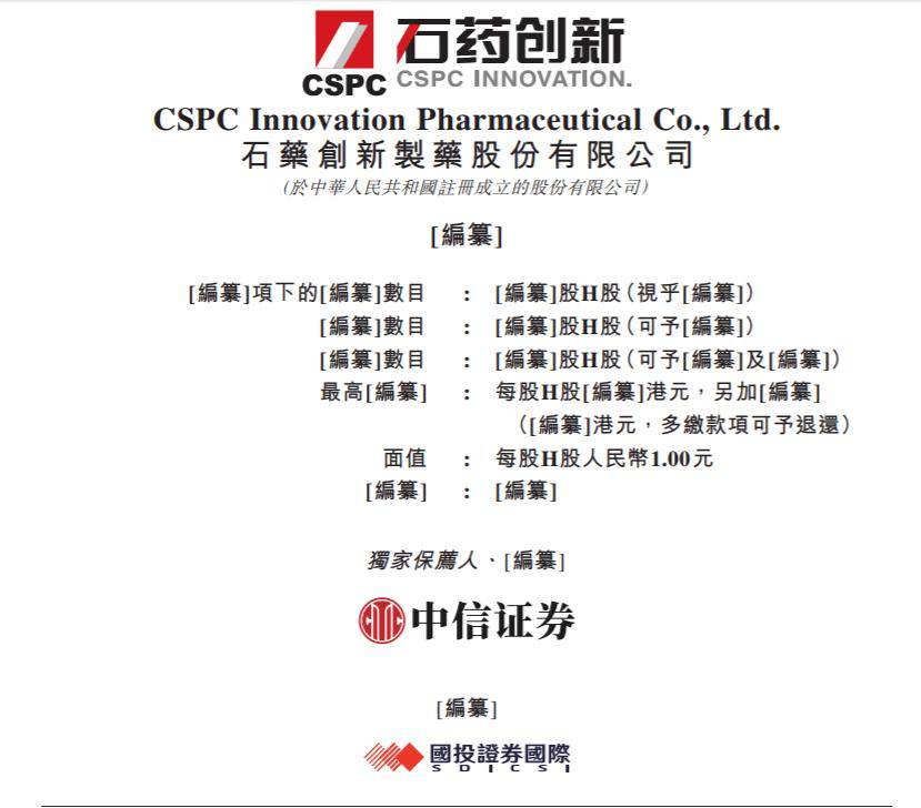 | [編纂]項下的[編纂]數目 | : [編纂]股H股(視乎[編纂]) | | --- | --- | | [編纂]數目 | .. [編纂]股H股(可予[編纂]) | | [編纂]數目 | 「編纂】股H股(可予[編纂]及[編纂]) :: | | 最高[編纂] | 毎股H股[編纂]港元,另加[編纂] | | | ([編纂]港元,多繳款項可予退還 | | 商值 | : 每股H股人民幣1.00元 | | [編纂] : [編纂] | | | 獨家保薦人、[編纂] | | 2025年12月10日,分拆自石药集团(01093.HK)、来自河北石家庄的A股上市公司石药创新制药股份有限公司 CSPC Innovation Pharmaceutical Co., Ltd.(原石 药集团新诺威制药股份有限公司)(以下简称"石药创新"或"新诺威")向港交所递交招股书,拟香港主板IPO上市。 新诺威(300765.SZ),于2019年3月22日在深交所上市,截至2025年12月10日收市,总市值约479亿元人民币。 石药创新招股书链接: https://www1.hkexnews.hk/app/sehk/2025/107949/do ...