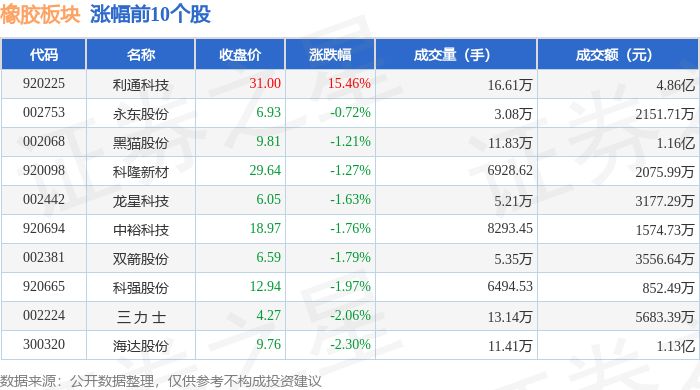 从资金流向上来看,当日橡胶板块主力资金净流出2.89亿元,游资资金净流入7856.11万元,散户资金净 流入2.11亿元。橡胶板块个股资金流向见下表: 证券之星消息,10月17日橡胶板块较上一交易日下跌3.49%,震安科技领跌。当日上证指数报收于 3839.76,下跌1.95%。深证成指报收于12688.94,下跌3.04%。橡胶板块个股涨跌见下表: | 代码 | 名称 | 收盘价 | 涨跌幅 | 成交量(手) | 成交额(元) | | | --- | --- | --- | --- | --- | --- | --- | | 920225 | 利通科技 | 31.00 | 15.46% | 16.61万 | | 4.86亿 | | 002753 | 永东股份 | 6.93 | -0.72% | 3.08万 | | 2151.71万 | | 002068 | 需猫股份 | 9.81 | -1.21% | 11.83万 | | 1.16亿 | | 920098 | 科隆新材 | 29.64 | -1.27% | 6928.62 . | | 2075.99万 | | 002442 | 龙星科技 | 6.05 | ...