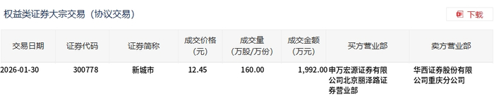 | 交易日期 | 证券代码 | 证券简称 | 成交价格 | 成交量 | 成交金额 | 买方营业部 | 卖方营业部 | | --- | --- | --- | --- | --- | --- | --- | --- | | | | | (元) | (万股/万份) | (万元) | | | | 2026-01-26 | 300778 | 新城市 | 12.40 | 40.00 | 496.00 | 广发证券股份有限 | 华西证券股份有限 | | | | | | | | 公司晋江崇德路证 | 公司重庆分公司 | | | | | | | | 券营业部 | | 1月26日,新城市大宗交易成交40万股,成交额496万元,占当日总成交额的5.84%,成交价12.4元,较市场收盘价13.95元折 价11.11%。 ...