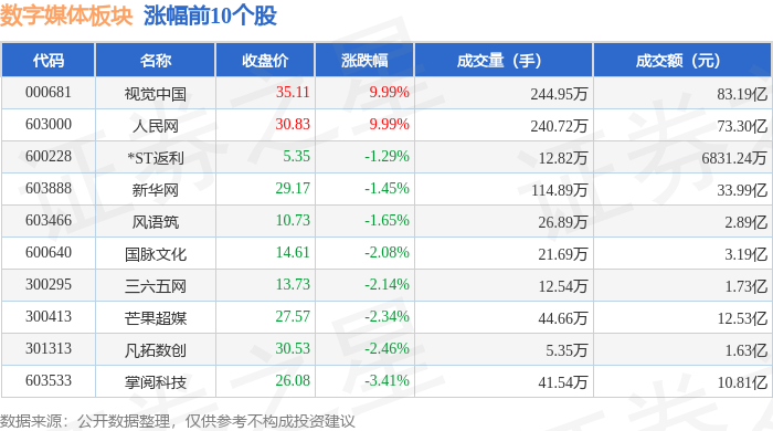 从资金流向上来看,当日数字媒体板块主力资金净流出1.28亿元,游资资金净流出2.77亿元,散户资金净 流入4.05亿元。数字媒体板块个股资金流向见下表: 证券之星消息,1月15日数字媒体板块较上一交易日上涨0.33%,视觉中国领涨。当日上证指数报收于 4112.6,下跌0.33%。深证成指报收于14306.73,上涨0.41%。数字媒体板块个股涨跌见下表: | 代码 | 名称 | 收盘价 | 涨跌幅 | 成交量(手) | 成交额(元) | | --- | --- | --- | --- | --- | --- | | 000681 | 视觉中国 | 35.11 | 9.99% | 244.95万 | 83.19亿 | | 603000 | 人民网 | 30.83 | 9.99% | 240.72万 | 73.30亿 | | 600228 | *ST返利 | 5.35 | -1.29% | 12.82万 | 6831.24万 | | 603888 | 新华网 | 29.17 | -1.45% | 114.89万 | 33.99亿 | | 603466 | 风语筑 | 10.73 | -1.65% | 26.89 ...
