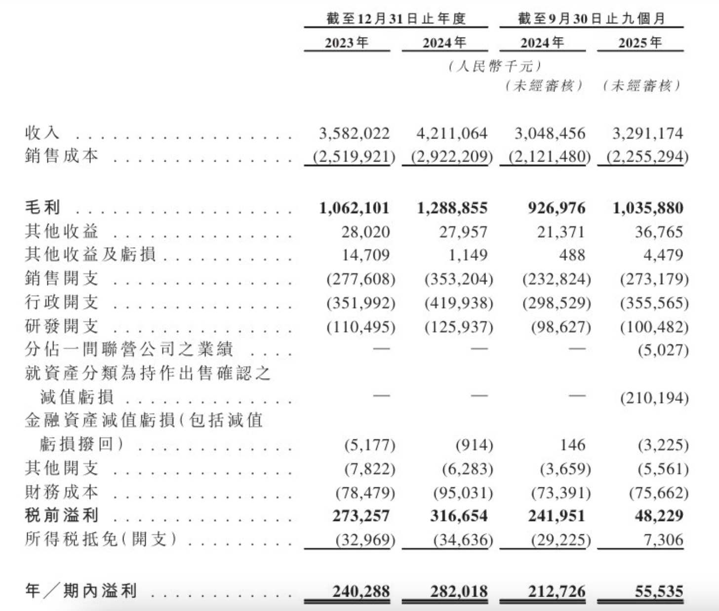 | | 截至12月31日止年度 | | 截至 | | --- | --- | --- | --- | | | 2023年 | 2024年 | 202 | | | | (人民幣千元) | | | | | | (未經 | | 收入 | 3,582,022 | 4.211.064 | 3,04 | | 銷售成本 | (2,519,921) (2,922,209) | | (2.12 | | 毛利用品 . | 1,062,101 | 1,288,855 | 97 | | 其他收益 ··· ·· ·· | 28,020 | 27.957 | | | 其他收益及虧損 .. | 14,709 | 1.149 | | | 銷售開支 | (277,608) | (353,204) | (23 | | 行政開支 | (351,992) | (419,938) | (26 | | 研發開支 | (110,495) | (125,937) | ( | | 分佔一間聯營公司之業績 | | | | | 就資產分類為持作出售確認之 | | | | | 減值虧損 | | | | | 金融資產減值虧損(包括減值 | | | | | 虧損發回) ...