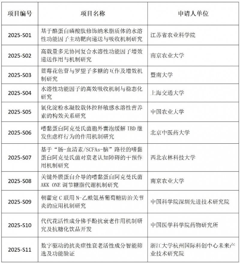 ·功能因子增效递送:围绕水溶性和油溶性功能因子的高效递送与稳态化等技术展开研究,提升营养成 分的生物利用度,为高效能产品开发提供底层支持。 ·营养健康机制:探索下一代益生菌阿克曼氏菌(AKK菌)如何作用于肠道健康、糖脂代谢和认知改善, 开拓营养健康新维度。 在营养健康产业加速向科技化、精准化演进的背景下,由中国食品科学技术学会与仙乐健康共同设立 的"中国食品科学技术学会食品科技专项基金—仙乐健康联合创新基金"(CIFST-SIRIO Nutrition, Health & Food Technology Innovation Fund)应运而生,并于近日公布了2025年度评审结果名单。 本次评审工作吸引了来自中国科学院深圳先进技术研究院、上海交通大学、浙江大学、中国农业大学等 国内多家知名科研机构和院校的高度关注与踊跃申报,最终11项具有前瞻性的科研课题脱颖而出。该批 项目聚焦营养健康领域的核心挑战,旨在通过支持前沿基础研究,为产业技术升级与产品创新提供关键 科学支撑。 经专家评审委员会严格遴选,本次获得资助的科研课题如下: | 项目编号 | 项目名称 | 申请人单位 | | --- | --- | --- ...
