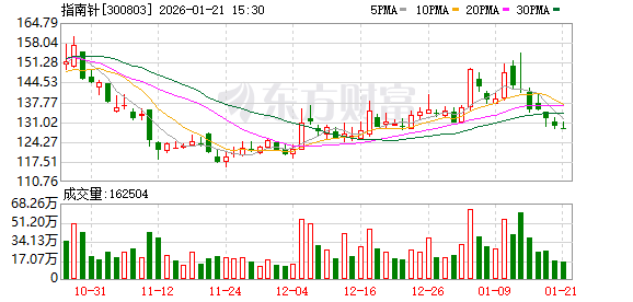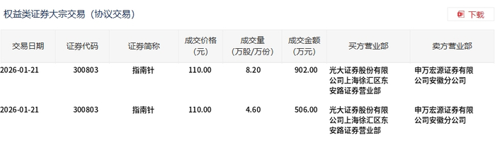 | 交易日期 | 证券代码 | 证券简称 | 成交价格 | 成交量 | 成交金额 | 买方营业部 | 卖方营业部 | | --- | --- | --- | --- | --- | --- | --- | --- | | | | | (元) | (万股/万份) | (万元) | | | | 2026-01-21 | 300803 | 指南针 | 110.00 | 8.20 | 902.00 | 光大证券股份有限 | 申万宏源证券有限 | | | | | | | | 公司上海徐汇区东 | 公司安徽分公司 | | | | | | | | 安路证券营业部 | | | 2026-01-21 | 300803 | 指南针 | 110.00 | 4.60 | 506.00 | 光大证券股份有限 | 申万宏源证券有限 | | | | | | | | 公司上海徐汇区东 | 公司安徽分公司 | | | | | | | | 安路证券型业部 | | 1月21日,指南针大宗交易成交12.8万股,成交额1408万元,占当日总成交额的0.66%,成交价110元, 较市场收盘价128.8元折价14.6%。 ...
