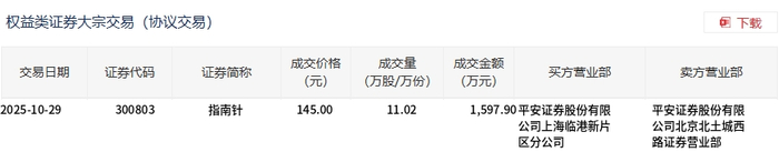指南针今日大宗交易折价成交11.02万股,成交额1597.9万元