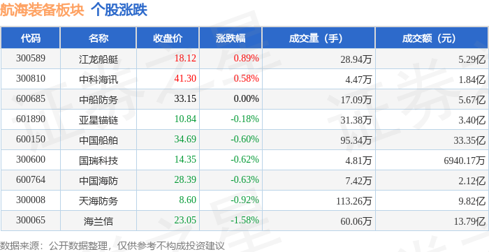 从资金流向上来看,当日航海装备板块主力资金净流入7416.14万元,游资资金净流出4187.8万元,散户 资金净流出3228.33万元。航海装备板块个股资金流向见下表: 证券之星消息,1月28日航海装备板块较上一交易日下跌0.57%,海兰信领跌。当日上证指数报收于 4151.24,上涨0.27%。深证成指报收于14342.9,上涨0.09%。航海装备板块个股涨跌见下表: | 代码 | 名称 | 收盘价 | 涨跌幅 | 成交量(手) | 成交额(元) | | --- | --- | --- | --- | --- | --- | | 300589 | 江龙船艇 | 18.12 | 0.89% | 28.94万 | 5.29亿 | | 300810 | 中科海讯 | 41.30 | 0.58% | 4.47万 | · 1.84亿 | | 600685 | 中船防务 | 33.15 | 0.00% | 17.09万 | 5.67亿 | | 601890 | 亚星锚链 | 10.84 | -0.18% | 1 31.38万 | 3.40亿 | | 600150 | 中国船舶 | 34.69 | -0.60% | 95 ...